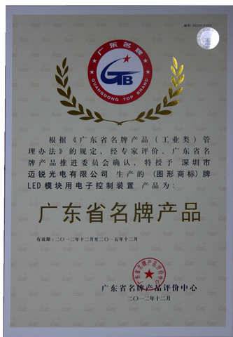 2012年11月,邁銳光電榮獲“廣東省名牌產(chǎn)品”稱號(hào)。